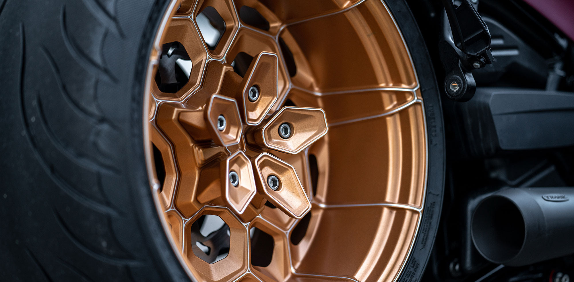 The key feature of this motorcycle is the new wheel design from Daytona27 and the Rick’s Motorcycles rear brake relocation kit. Finally, there’s an affordable solution for a stock swingarm that hides the rear brake. We'll be making an additional post about this relocation kit soon.