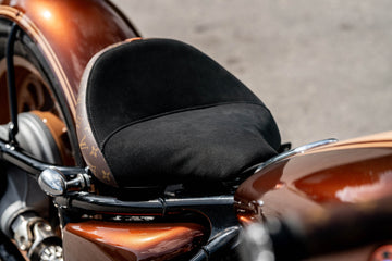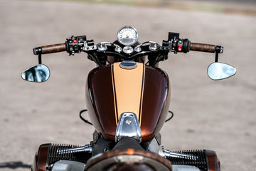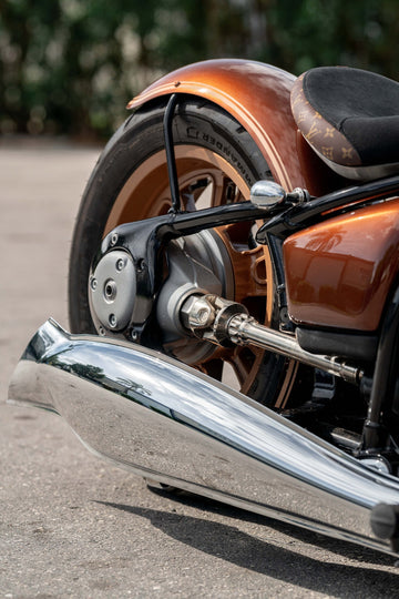 Custom-made aluminum fenders are fitted using handcrafted brackets. The seat design takes inspiration from the Triumph Bobber, with a specially fabricated sliding bracket for mounting. The motorcycle retains its stock wheels, but the rims have been powder-coated in Colorado Beige.