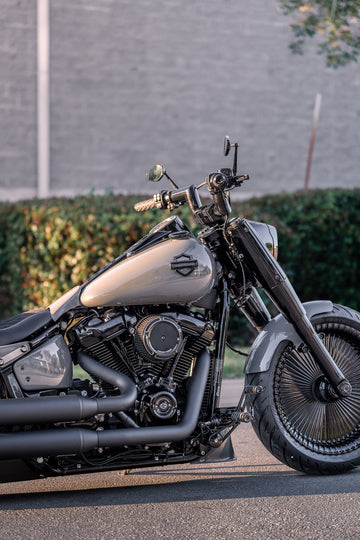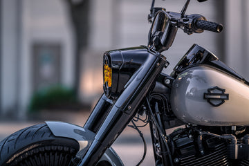 This bike features 4-inch raised handlebars, with traditional grips, levers, and mirrors from Arlen Ness. And of course - the integrated Baja Designs LP6 into the Fat Boy fairing. We’ll be releasing this part soon.