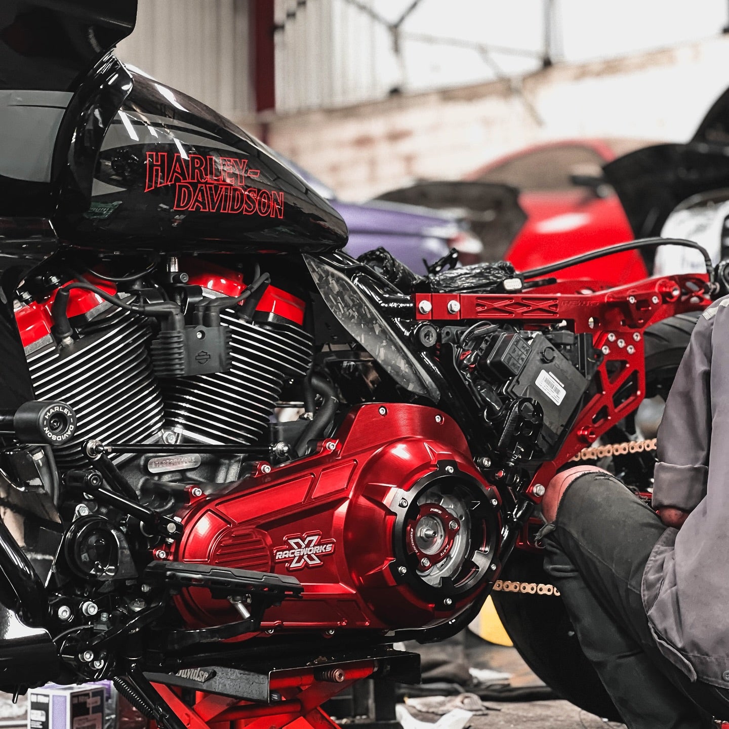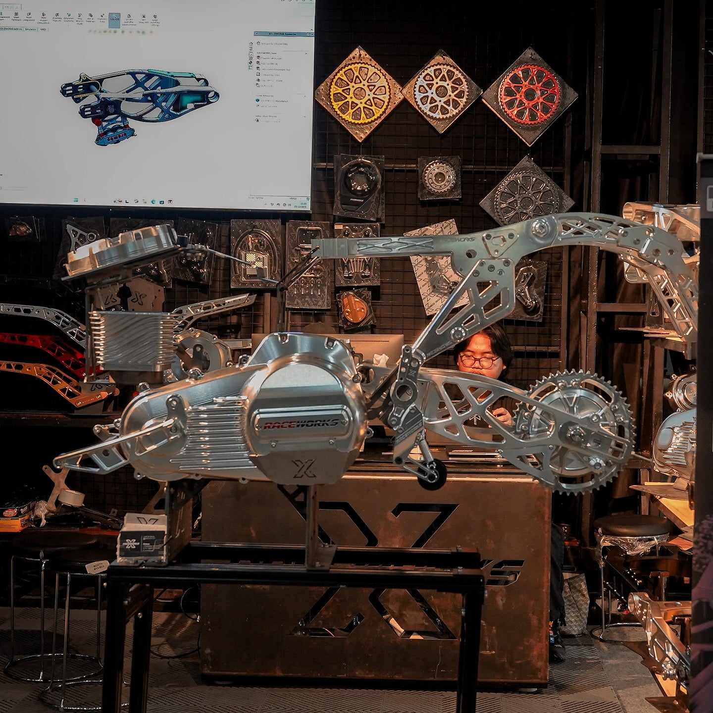 Walk into the Raceworks facility and it feels more like a motorsport lab than a garage. Rows of CNC machines hum as billet 7075-T6 aluminum is carved into swingarms, subframes, and primary covers that are as strong as they are stunning.