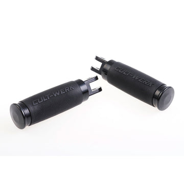The Cult-Werk foot pegs "Racing" (2 pieces as shown) suitable for Harley-Davidson Softail models from 2018 to current (NOT SUITABLE: for models with running boards), Nightster models from 2022 & Sportster S models from 2021!The footrests were milled from an aluminum part and then powder-coated in glossy black. In addition, an elaborately designed rubber with Cult-Werk lettering was produced to ensure a perfect grip and to round off the set visually perfectly! The footrests are attached to the motorcycle just like the original parts!